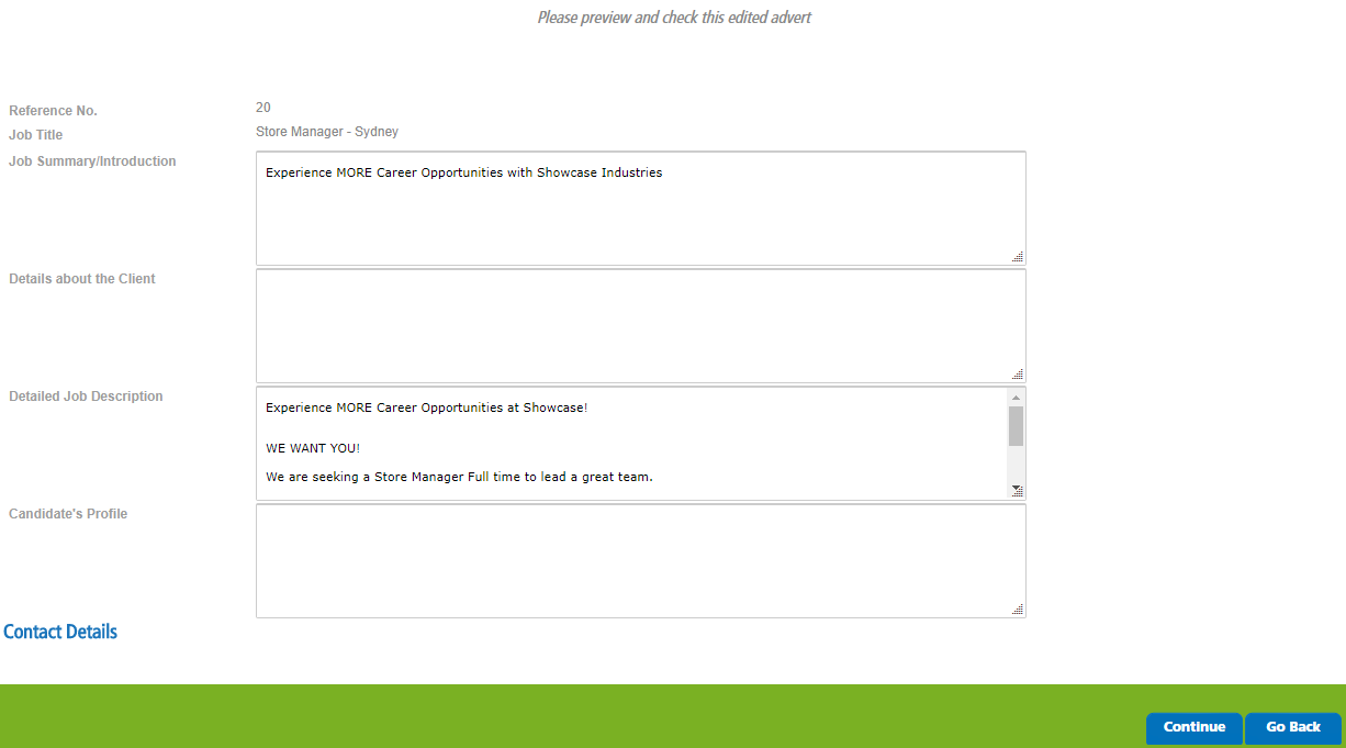 7. Preview and check this edited advert, Click Continue or Go Backto make changes