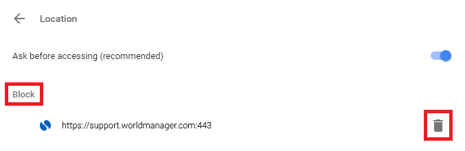 - If you see your platform in the 'Block' list, click the rubbish bin icon to remove it (as below)