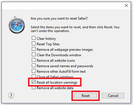 - Once the pop-up window appears, uncheck all options, except for "Reset all location warnings"