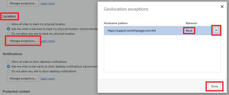 - Scroll down, then click on the "Manage exceptions..." button under 'Location'