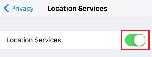 - Ensure the 'Location' Services' setting is switched to the on position (as below)