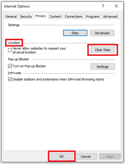 - Click on the "Clear Sites" button under 'Location', then click on the "OK" button (as below)