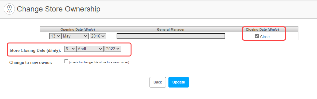 Once this Custom Field is activated you can close locations by adding a close date by clicking modify on the field: