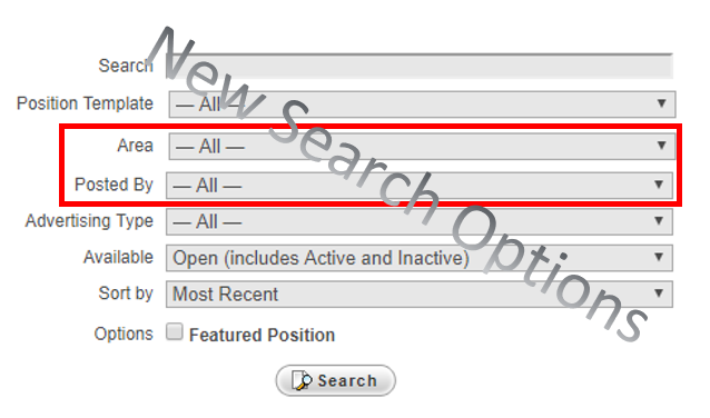 On the Positions page, additional filtering fields have been introduced, including 'Area' and 'Posted By'.