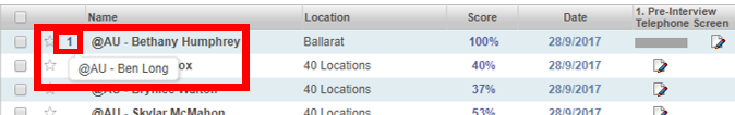 In the example below you can see the number '1' next to the applicant 'Bethany Humphrey' which indicates '1' manager has previously starred that applicant. By hovering over the icon it shows the names of that manager, 'Ben Long'.