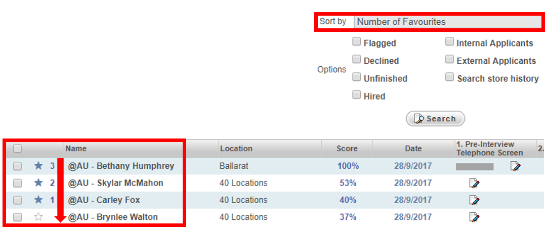 Additionally, we have added a new 'Sort By' option to the Talent Pool page, sort by: 'Number of Favourites', so you can filter through in order of the most starred applicants, with the highest number of starred applicants showing at the top. In the example below, 'Bethany Humphrey' has been starred by three other Managers and the remaining list of applicants is in descending order.