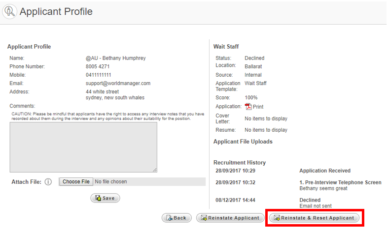 When viewing a declined applicant there is a now a new option called Reinstate & Reset Applicant