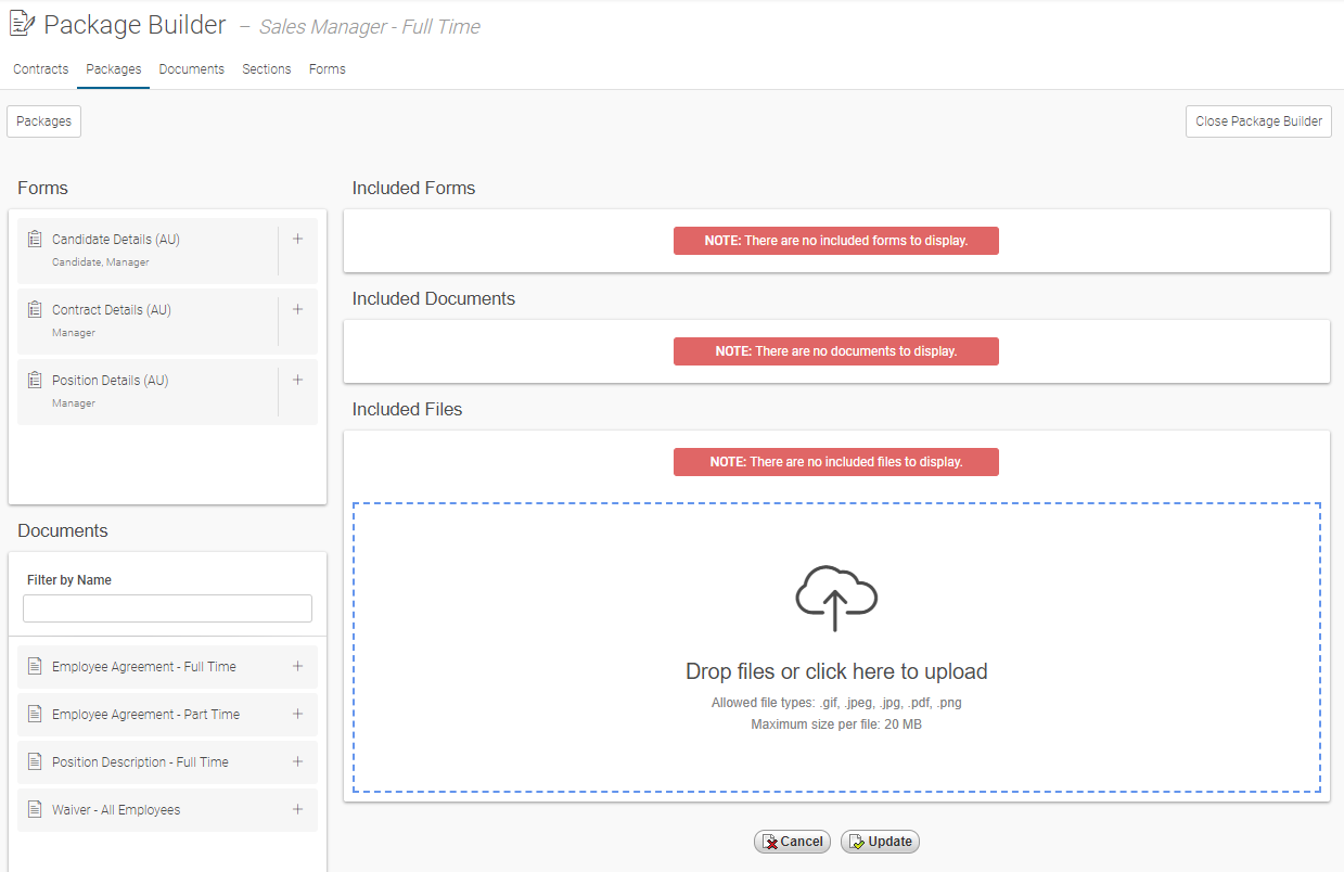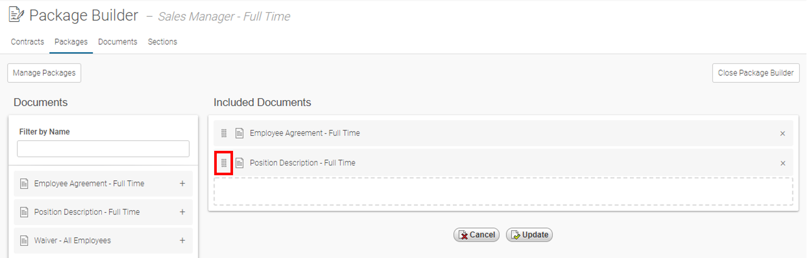 16. Once you have finished your Package, Click Update and you should see the message: Employee Agreement - Full Time was successfully updated.