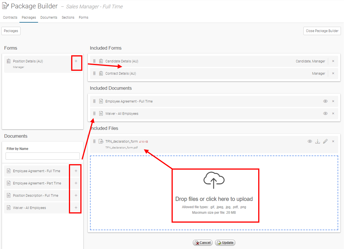 13. You can now add each applicable Form(s), Document(s) by clicking on the + as below or Drop files: