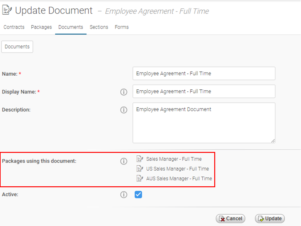 Note: Documents cannot be added to Packages unless they are Active, Documents can be activated on the Documents page