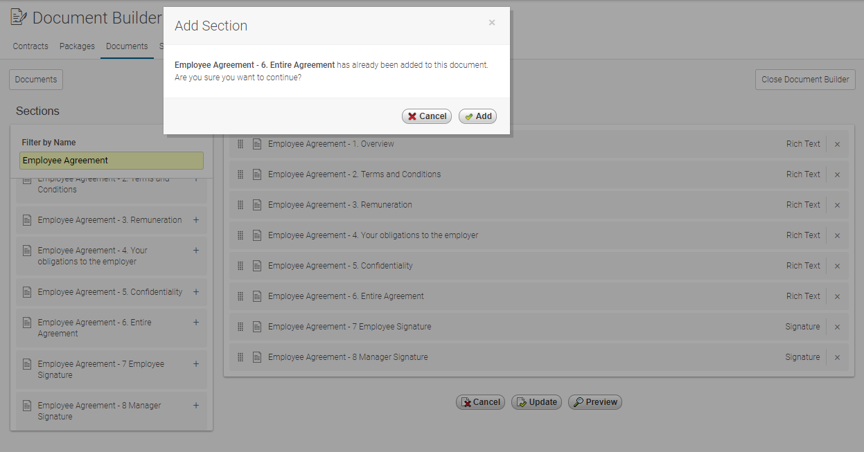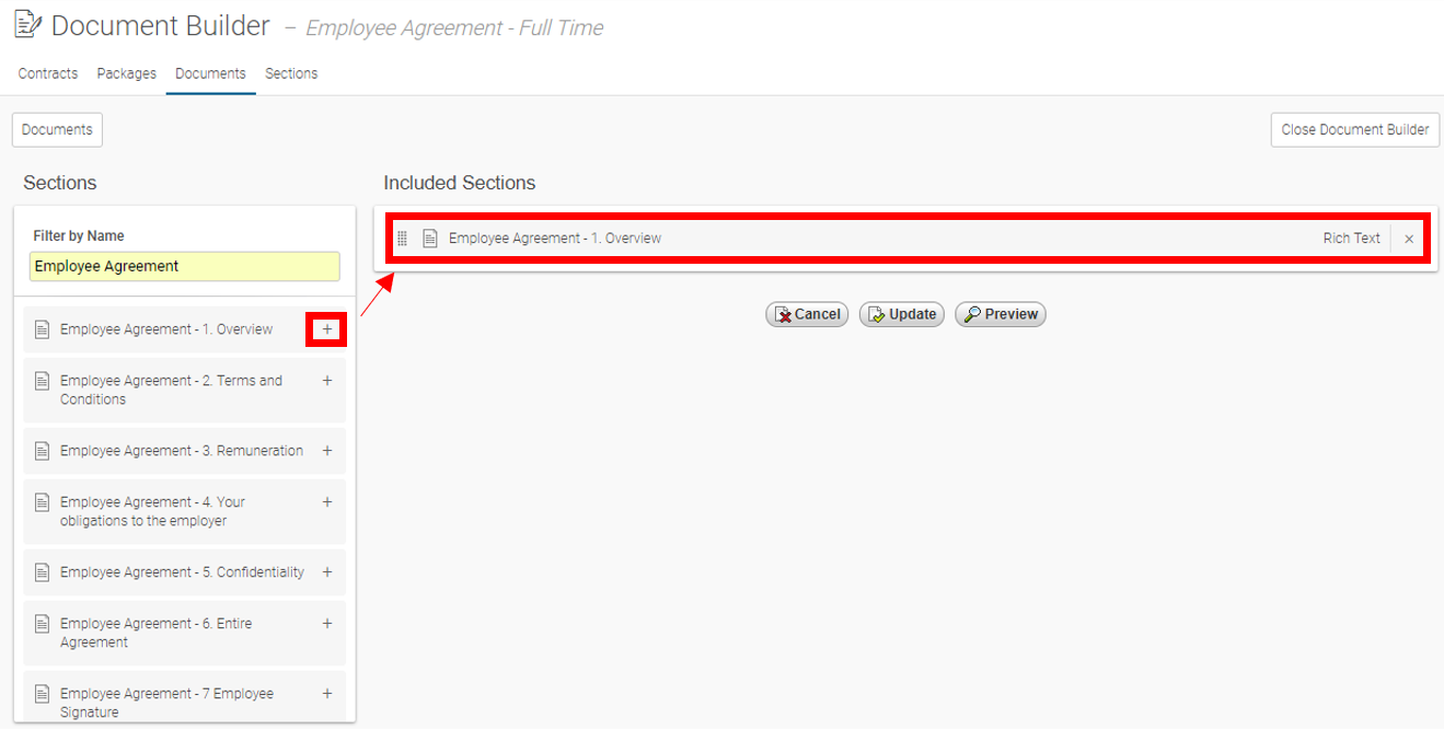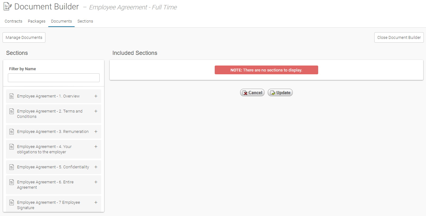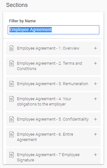 Tip: Use the Live Filter to search for the applicable Section(s) simply by typing characters and it will return all results automatically, E.g. 'Employee Agreement'