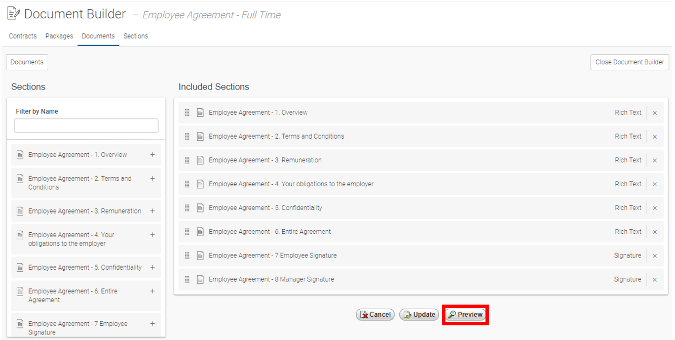 - Preview - Previews the Document as a PDF (only once Sections are added to the Document)
