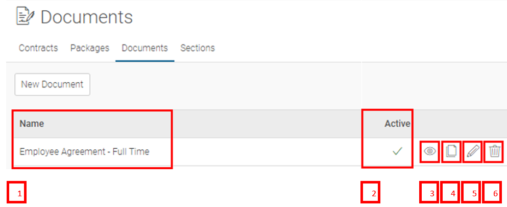 7. Now that the Document Name has been created and the status is Active, we can add Sections, to do this click on the title of the Document or the 'edit' icon highlighted in Red above