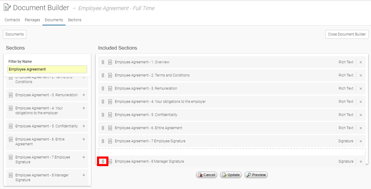 12. Once you have finished your Document, Click Update and you should see the message: Employee Agreement - Full Time was successfully updated.