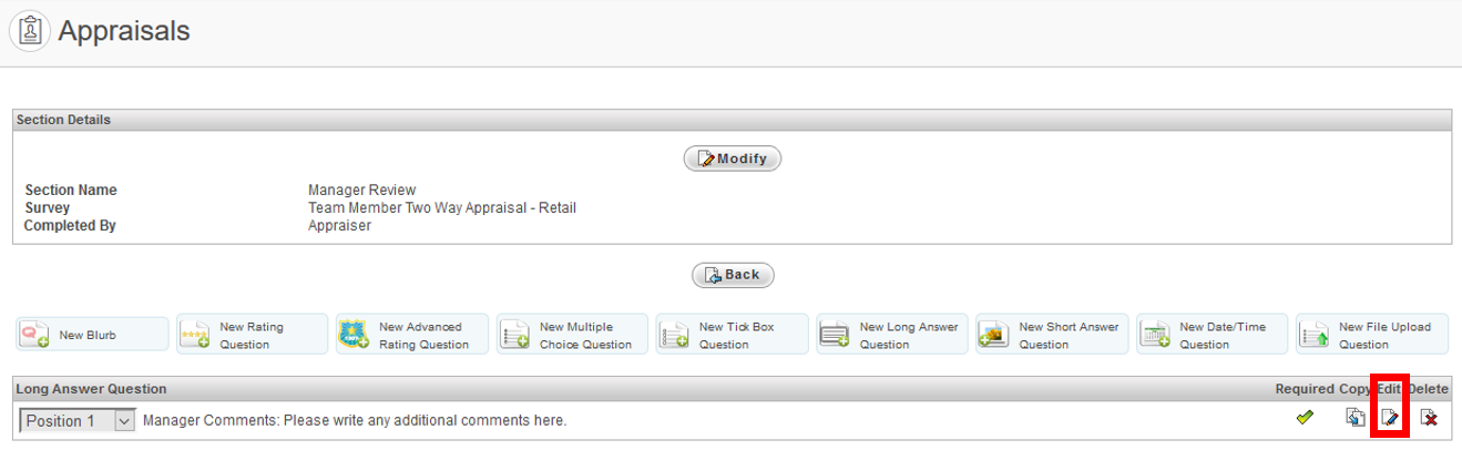 1. First, we need to link the Question to another Question in a different Section. Go to the Two Way Appraisal and click the 'Edit' icon, in this example the Appraiser Section (Manager Review)