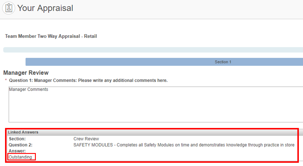 2. Once the Appraisee has completed the Appraisal, the Appraiser will see the Answer to the Linked Question(s) as below