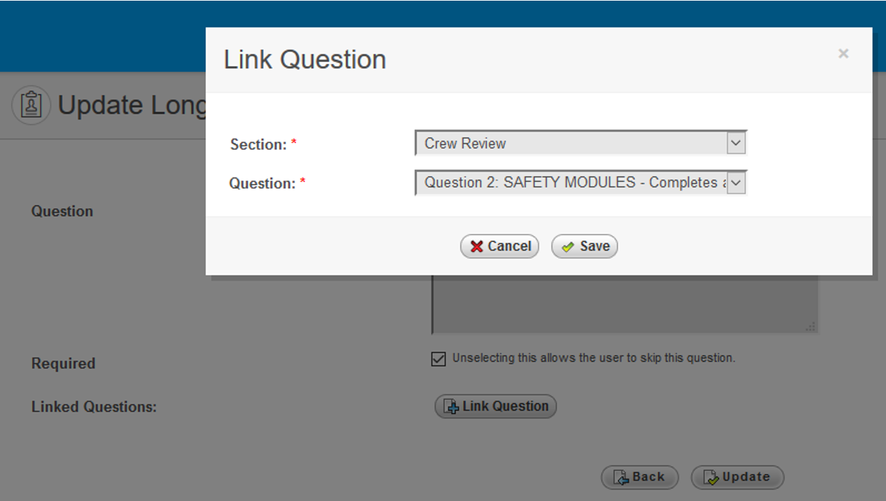 4. Choose a Question from another Section to Link to this Question. In this example, we are choosing the Appraisee Section (Crew Review) and the Question (Question 2: Safety Modules).