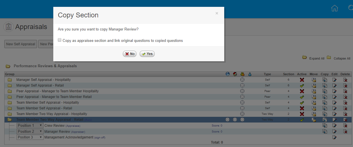 Ticked - Will duplicate the Section as the opposite type. In this example, the original section was an Appraiser Section, the duplicated Section will be created as an Appraisee Section. All Questions in the copied Section will be linked back to the Questions of the original Section.