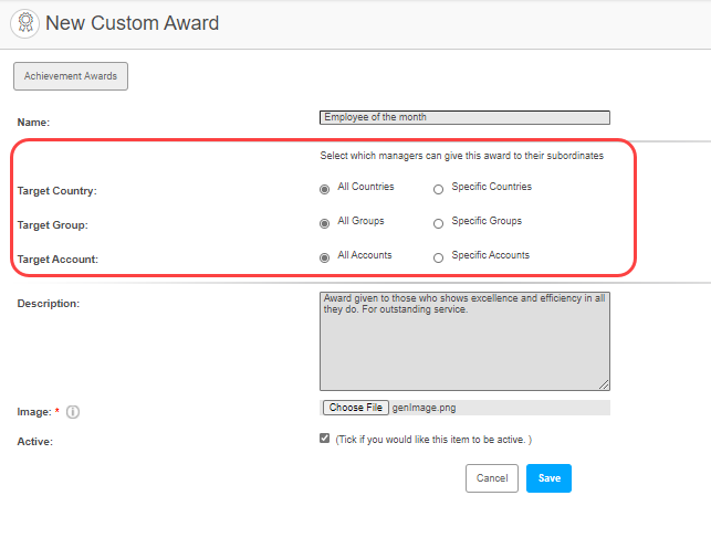- Active – Checkbox that decides whether or not the award is active – effectively whether or not anyone will be awarded this award.