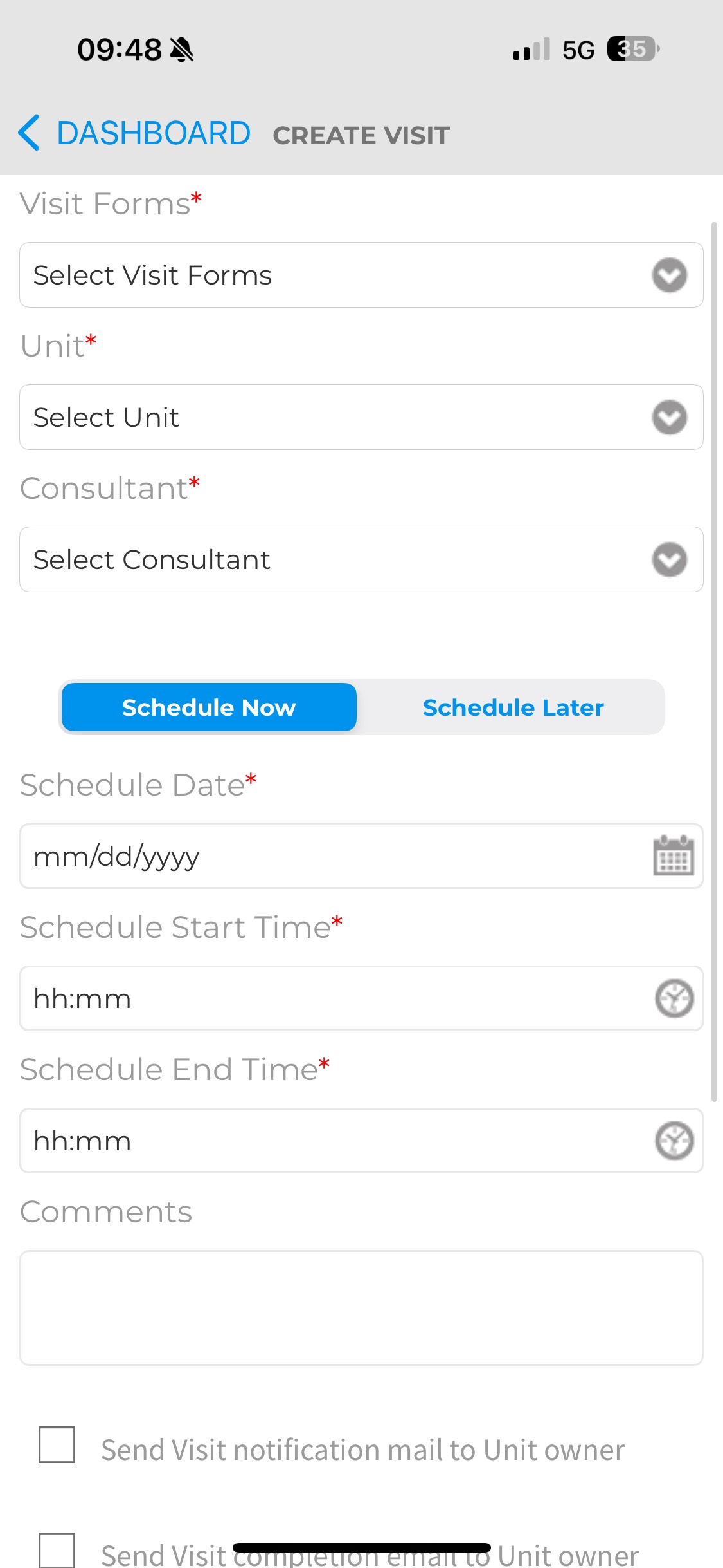 You can either schedule the visit now or schedule it later. Additionally, you are able to create the visit and start it immediately from here if you choose. Once you have finished creating the visit, you will be taken to the visits page, where you can see your new visit has been created. This will not occur if you chose to start the visit immediately.