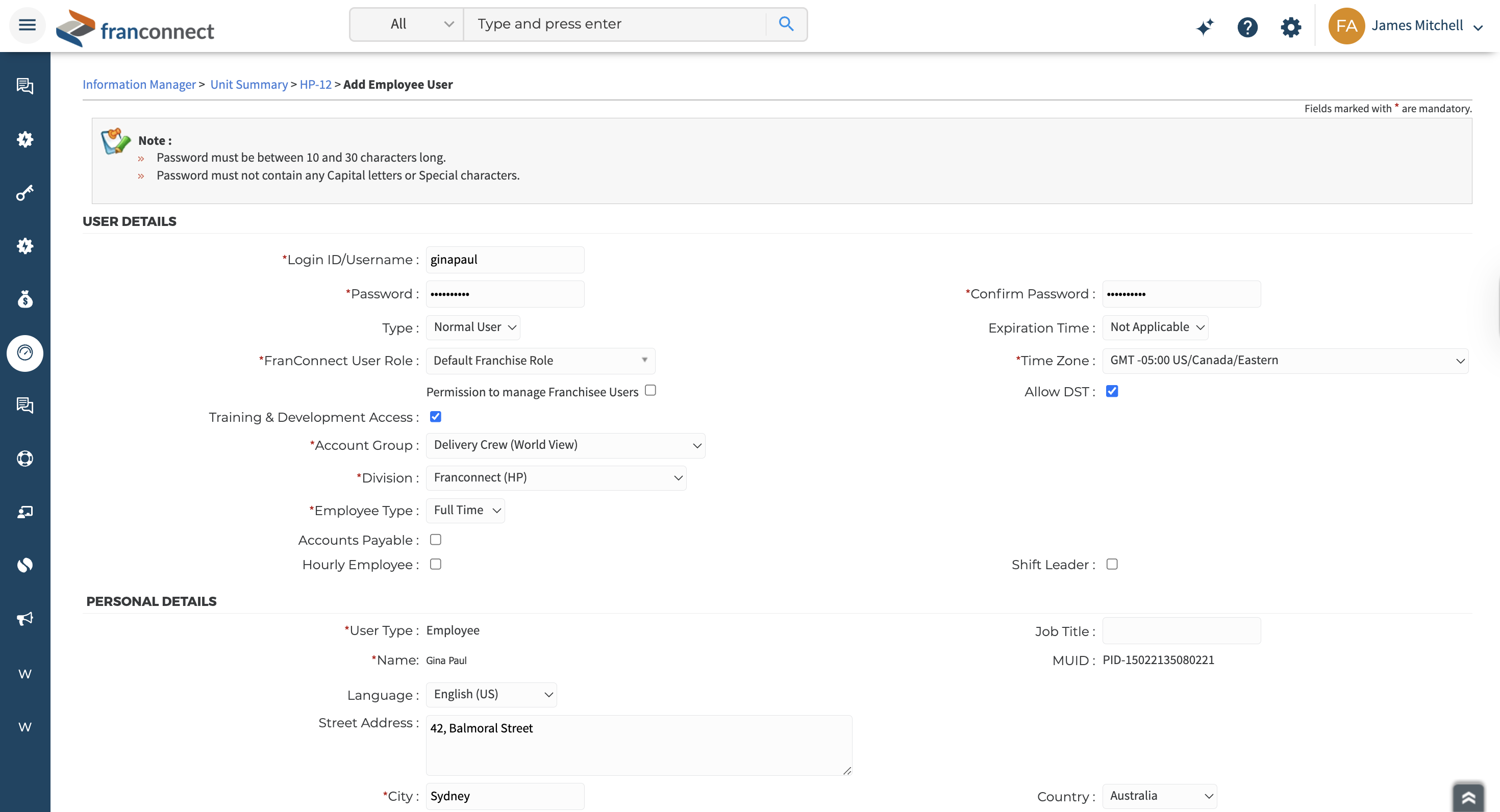 Your employee record and user account are now successfully created.