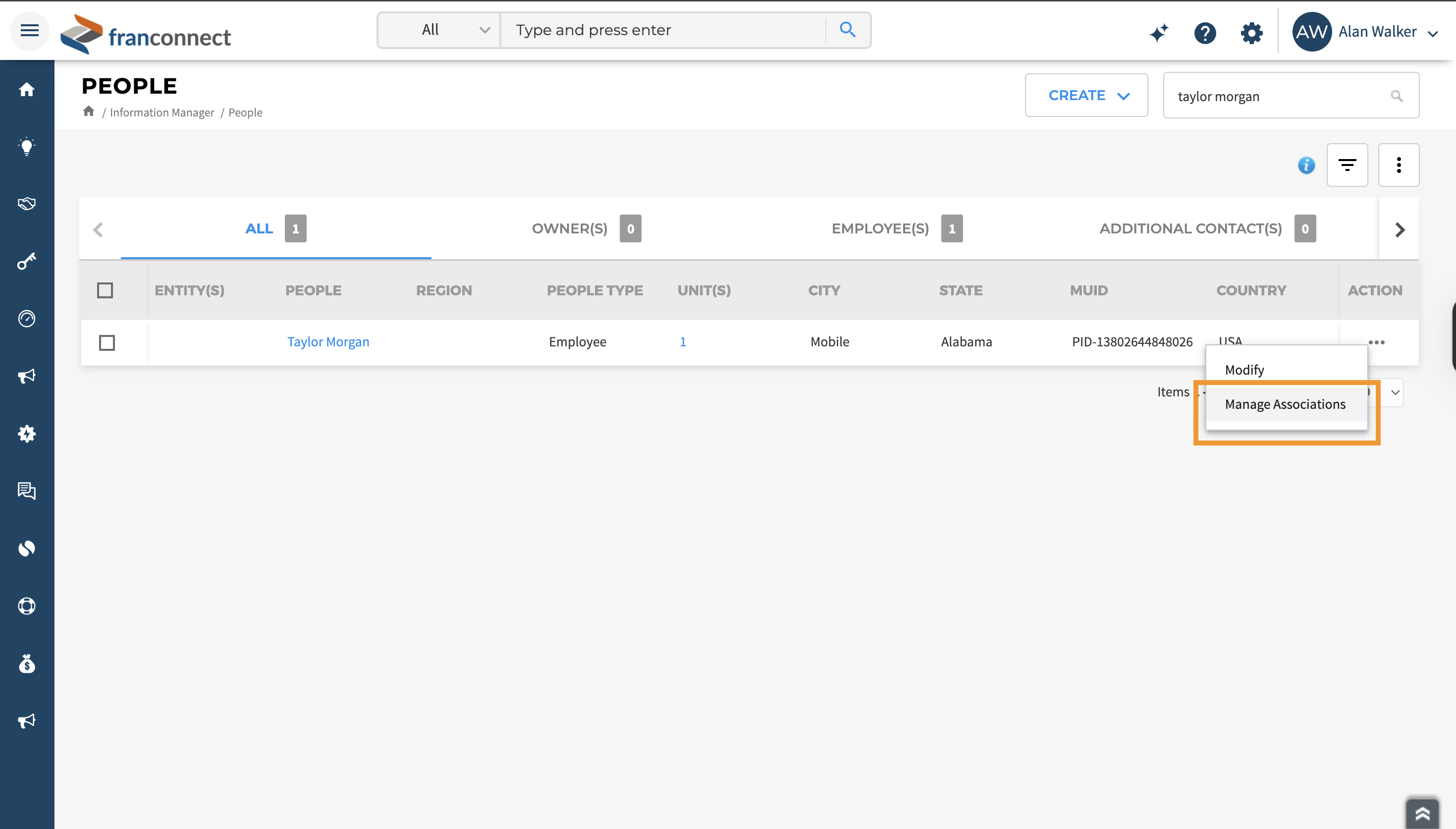 Navigate to your user and select Manage Associations from the drop-down menu adjacent to the user in question.