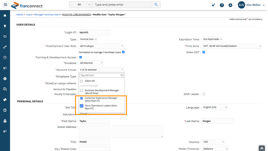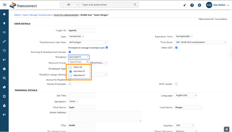 After saving, the user will have access to multiple locations across multiple Divisions, along with the assigned Account Groups in Training & Development (World Manager).