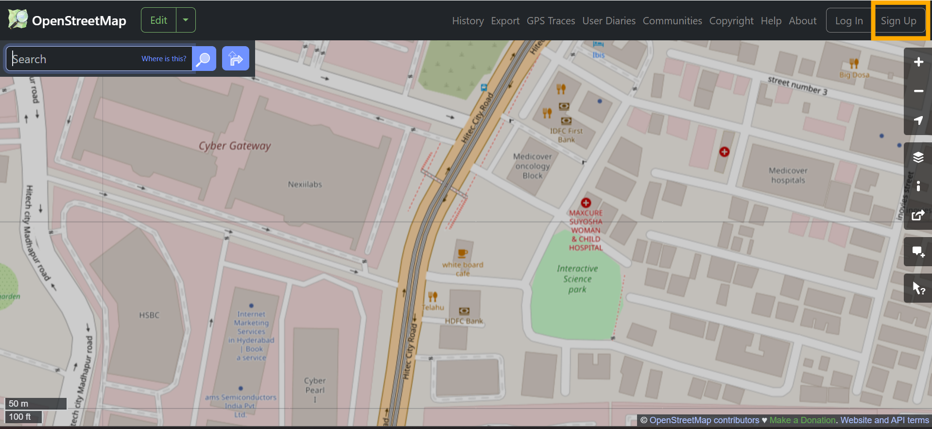 - If you already have an OpenStreetMap account, simply use the Log In button located next to Sign Up in the top-right corner.