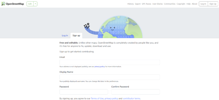 - Navigate to openstreetmap.org and select the Sign Up button in the top-right corner.
