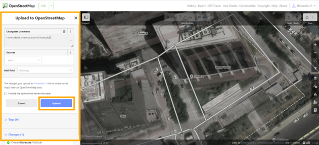 - When ready, click Upload to submit your contribution to OpenStreetMap. After review and approval, your changes will be added to the OSM database.