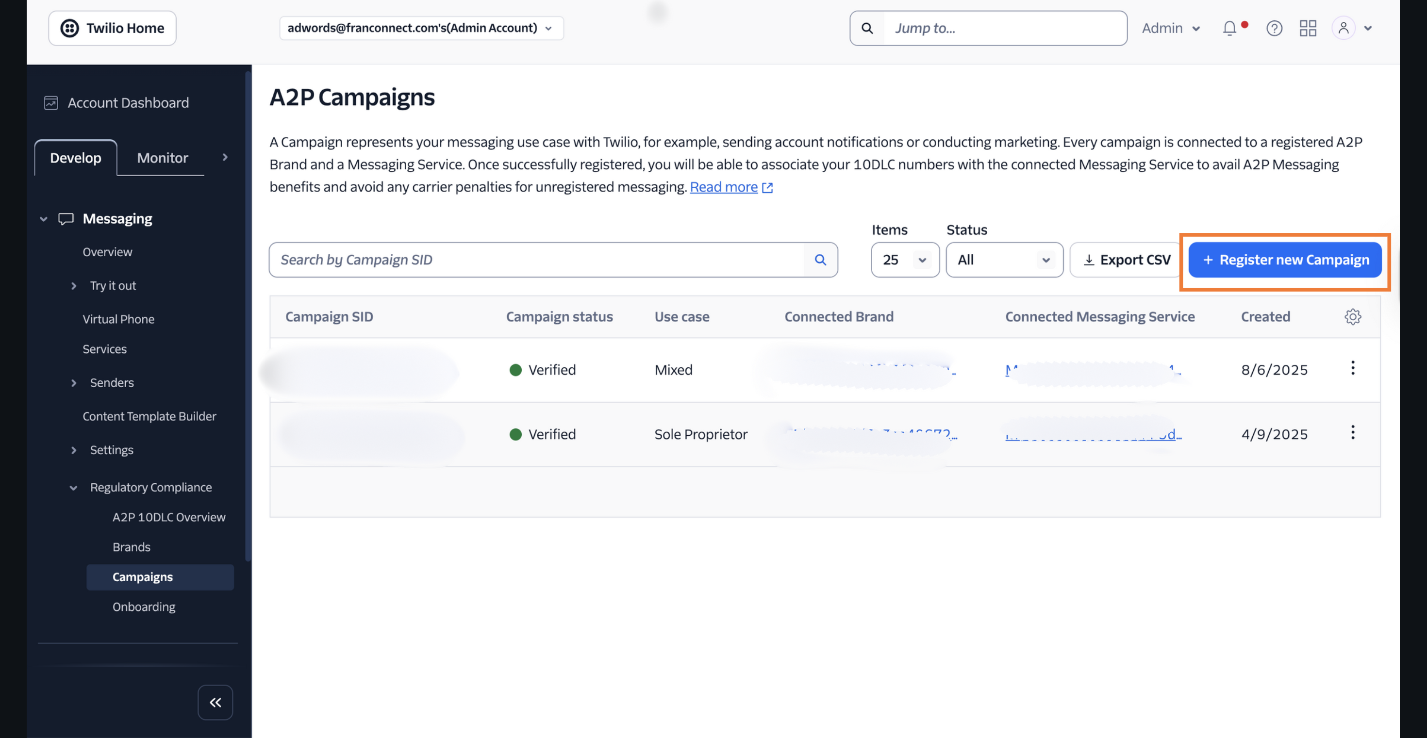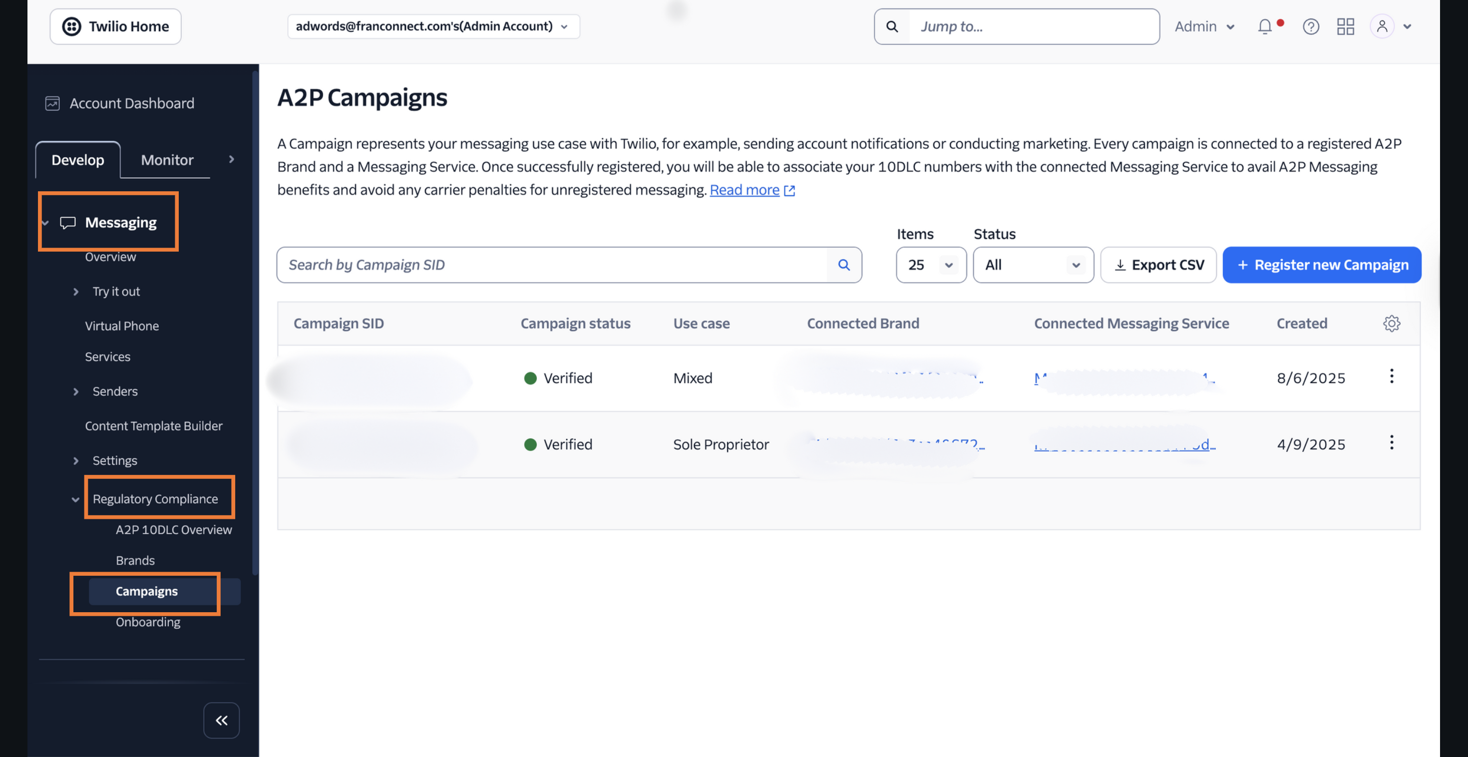 - Navigate to Messaging > Regulatory Compliance > Campaigns.