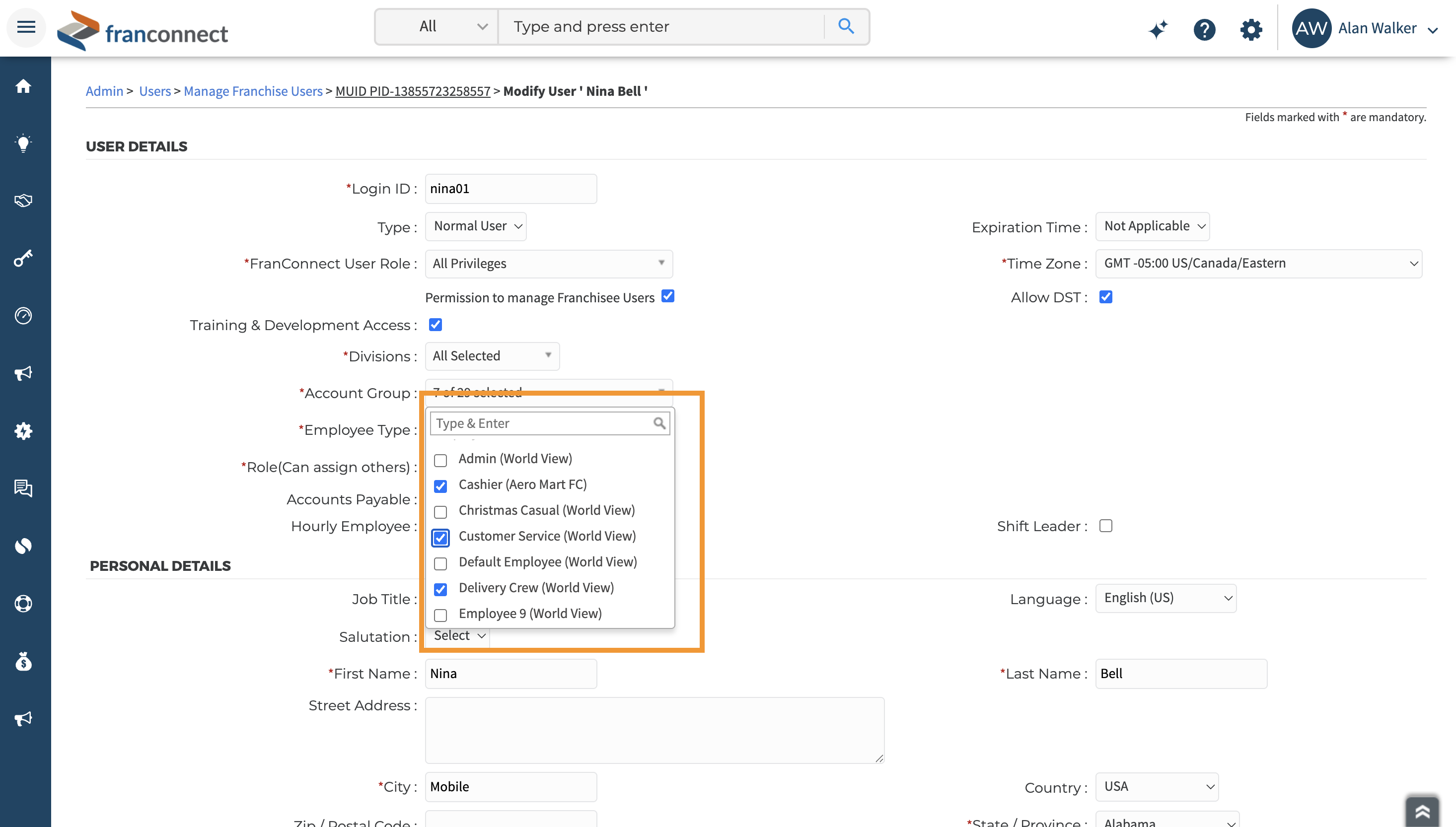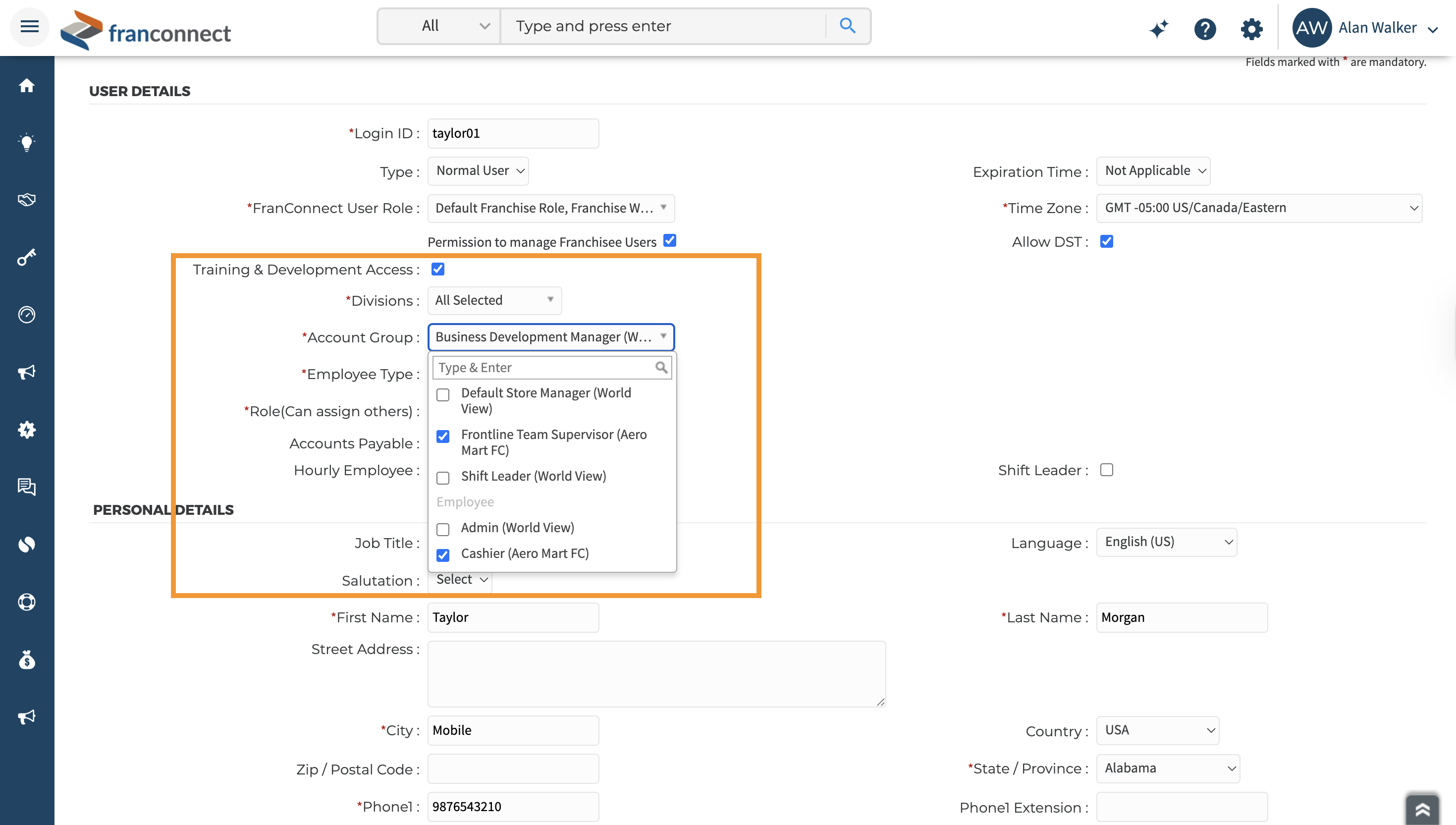 Multi Account Groups are assigned when creating or editing a user. You can assign multiple account groups to all types of users including World Manager, National Manager, Area Manager, General Manager, Store Manager and Employee.