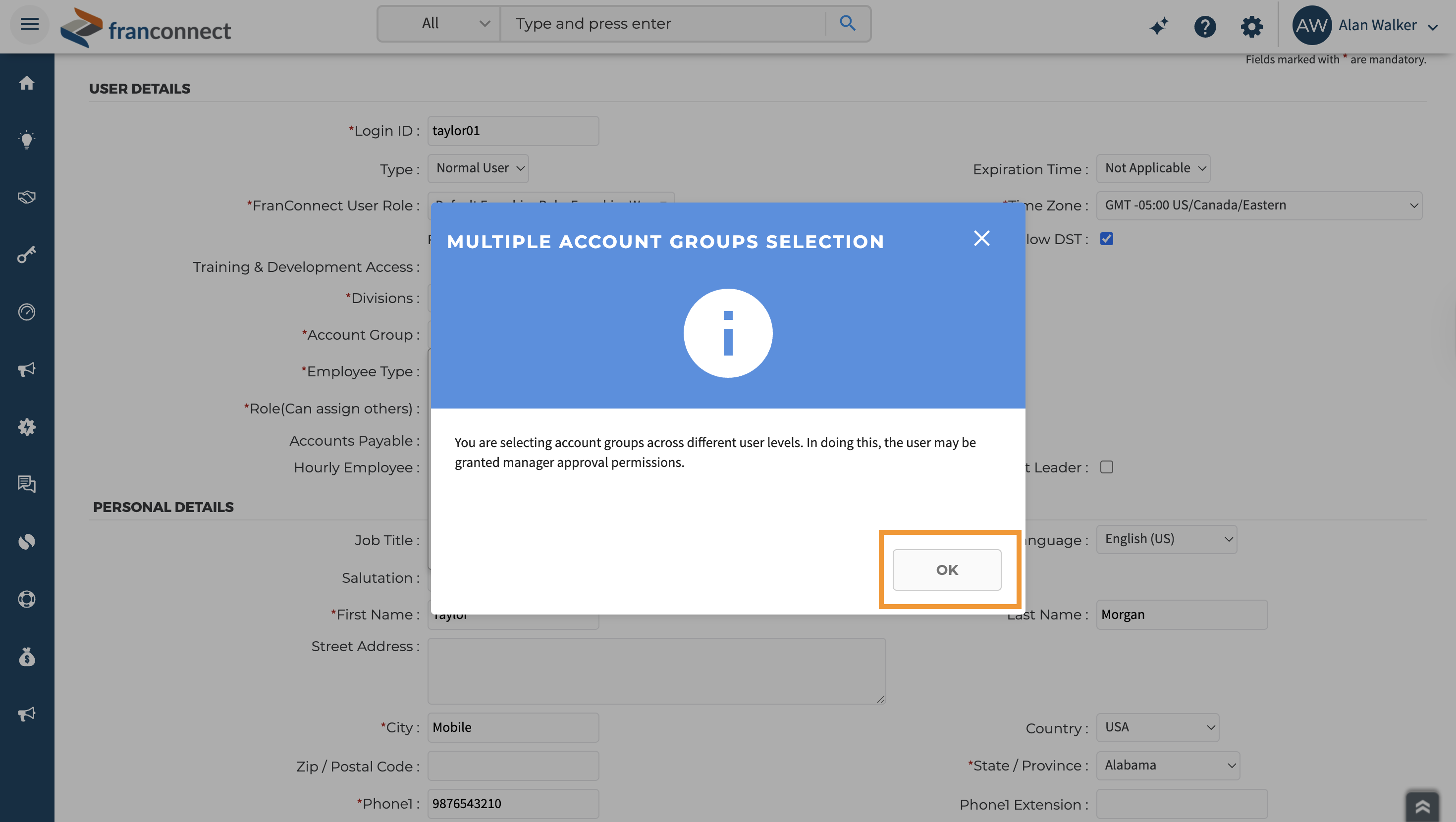 You'll get a pop-up alerting you that doing this, the user will get manager level permissions since you have selected groups across levels.